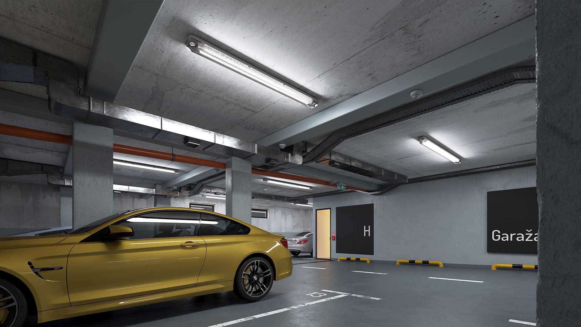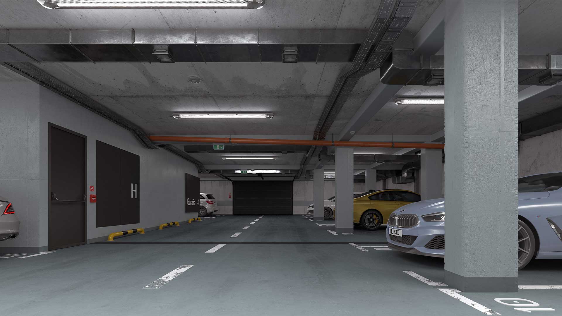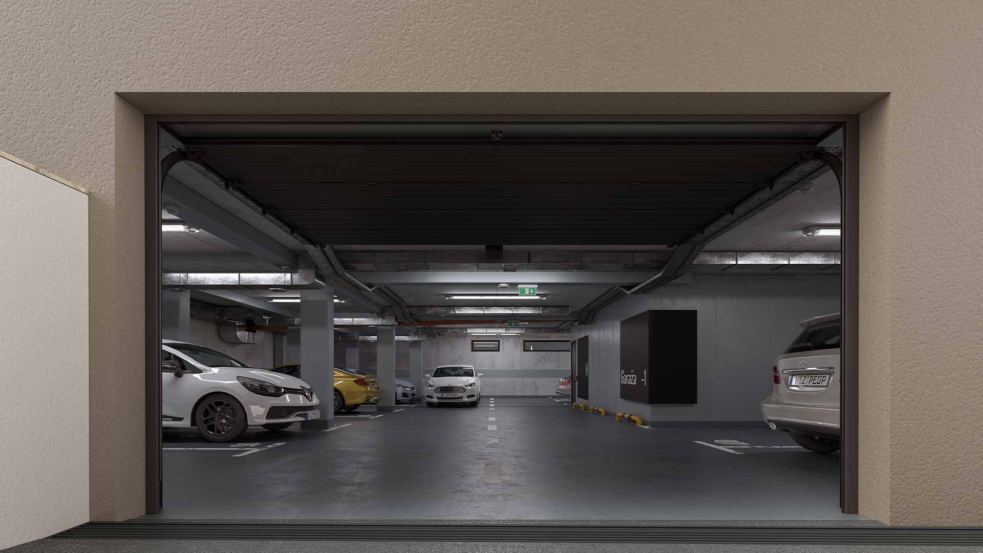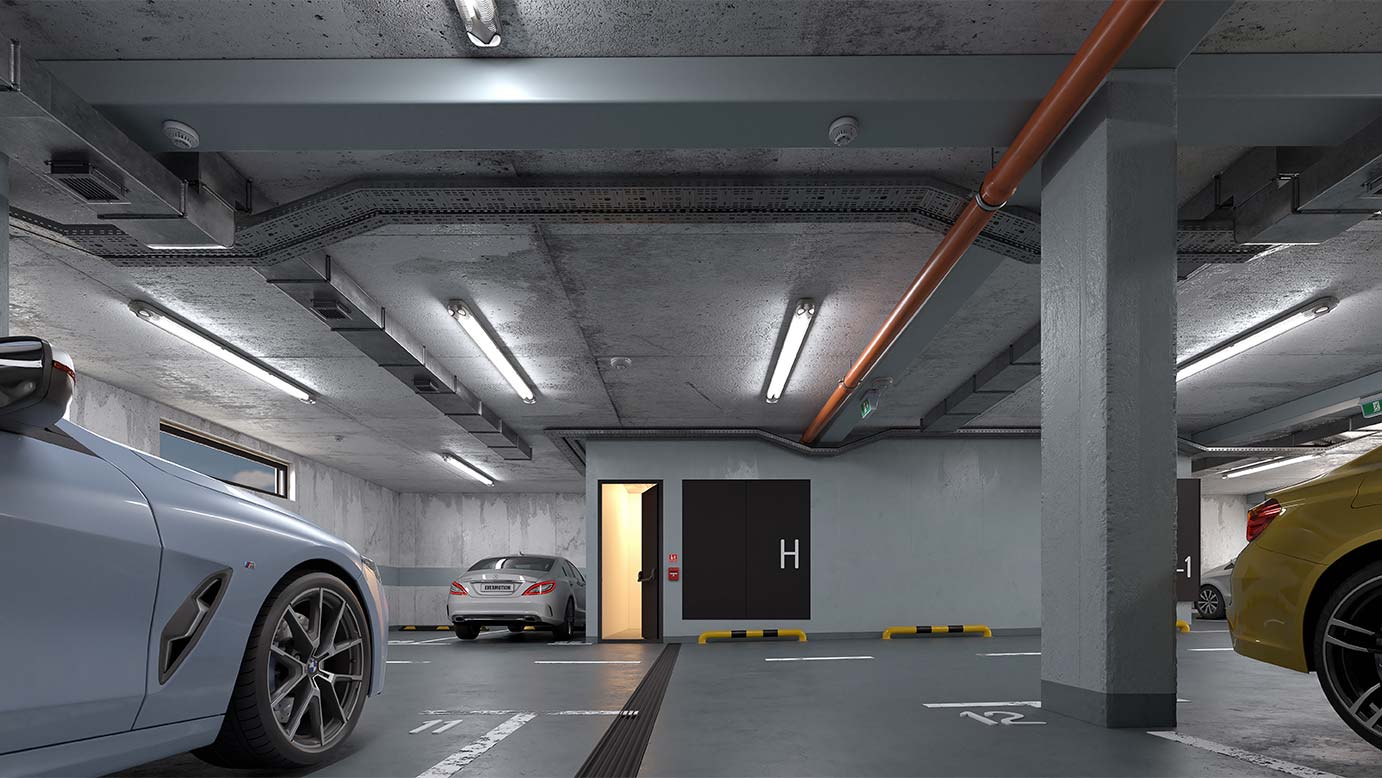 Lift vodi stanare direktno do podzemne garaže u kojoj se nalazi 18 garažnih mesta. Pristup garaži, omogućen je jednosmernom rampom, blagog nagiba, a komforan prostor unutar garaže omogućava lako manevrisanje vozila. Garaža je opremljena svom neophodnom opremom za detekciju ugljen-monoksida i ventilaciju prostora.